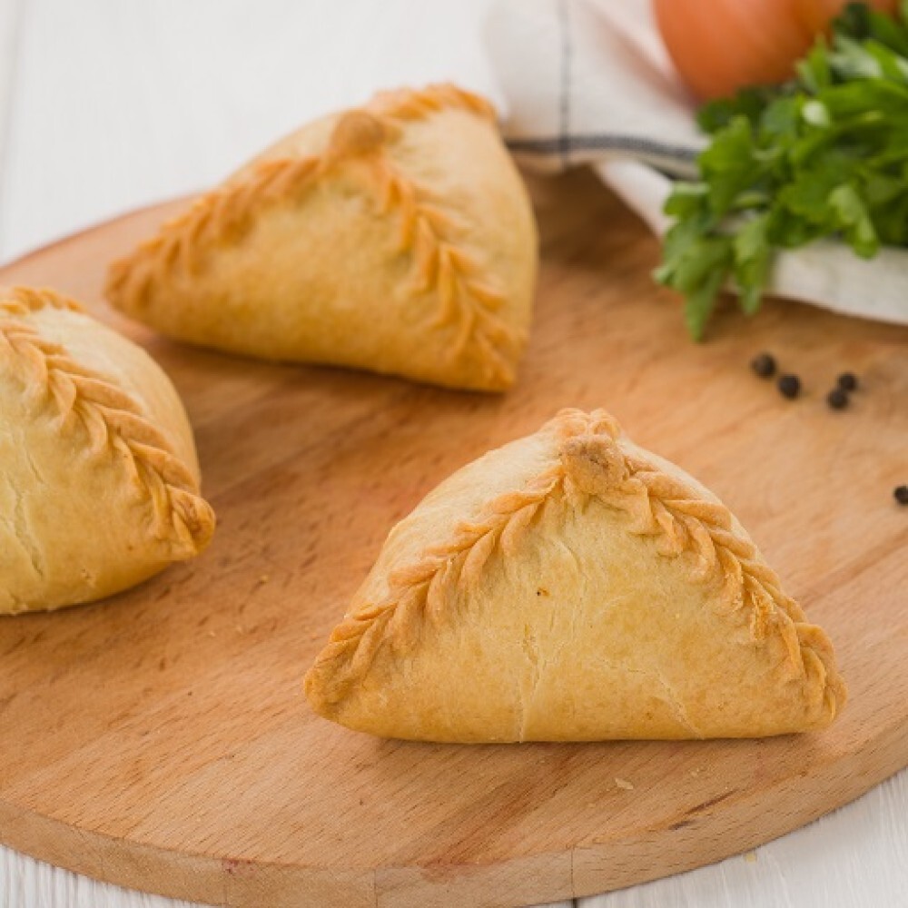 Мука пшеничная, маргарин, сметанный продукт с заменителем молочного жира, яйца, соль поваренная пищевая, фарш ,говядина, картофель, лук репчатый, соль поваренная пищевая, перец черный молотый.